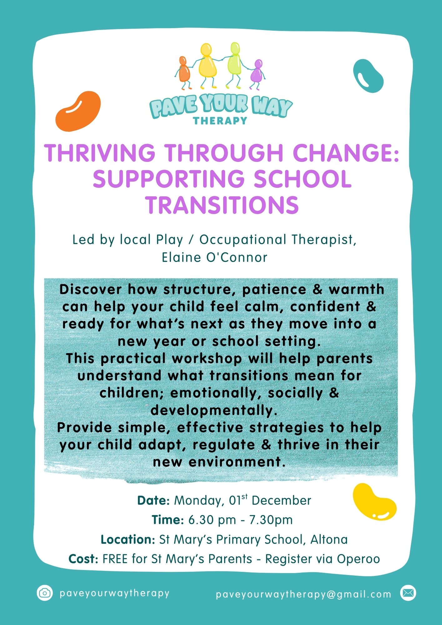 Remember, next Monday 1st Dec, 6:30 - 7:30pm, we also have our final Parent Workshop for 2025 titled 'Thriving through change, surviving school transitions' and presented by Elaine O'Connor (parent and Occupational Therapist).
